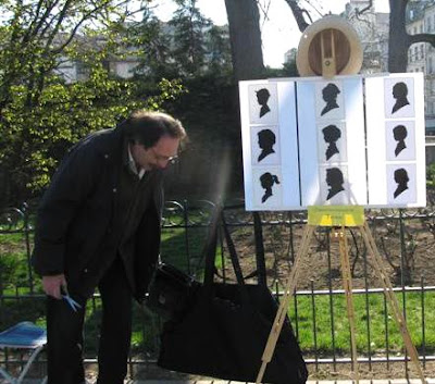 This Parisien artist outside Notre Dame is busy creating sillouette patterns from black paper, his sissors are ready to do your portrait.